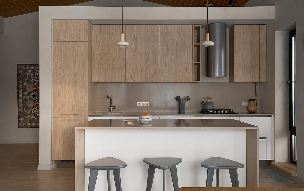 С островом — для просторных кухонь. Дополнительный рабочий центр с местом для техники и хранения. Может служить зоной для перекусов. Придаёт интерьеру современный вид.