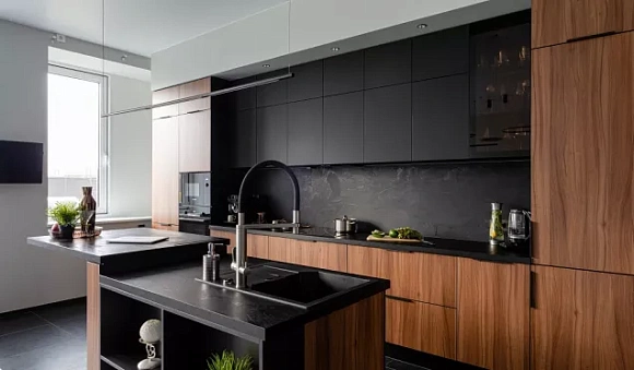 Эксперты настоятельно рекомендуют использовать кухонный гарнитур черного цвета в студиях, которые объединены с гостевыми помещениями, коридорами либо балконами. Это обусловлено тем, что в таком пространстве кухонная мебель обладает максимальным эффектом и при этом визуально привлекает к себе внимание окружающих. Необходимо четко понимать, что темные фасады акцентируют внимание на четких формах и красиво смотрятся со светлой отделкой, деталями из позолоты или под мрамор. Рассматриваемый кухонный гарнитур может иметь любой тип поверхности. К наиболее распространенным принято относить: