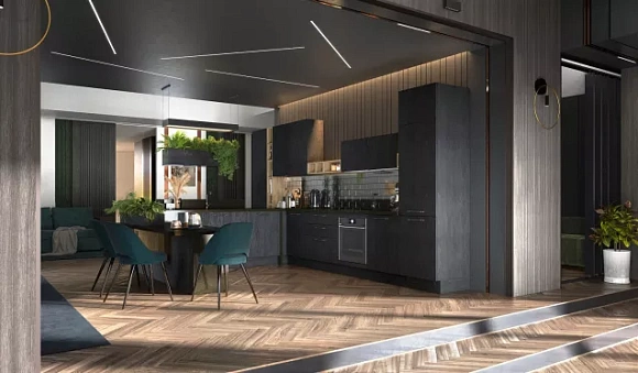 - любая современная кухня черного цвета обладает привлекательным внешним видом, если предварительно объединить ее с имеющейся гостиной комнатой либо использовать в качестве проходной.