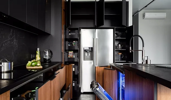 По мнению психологов, кухни в черных тонах оказывают положительное воздействие на психику человека. При этом существенно повышается мотивация к развитию персонального творческого потенциала и гарантируется максимальный уровень концентрации.