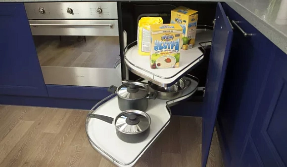При покупке гарнитура в синих тонах, необходимо учитывать его конфигурацию и размеры помещения. Правильно подобранная мебель для кухни не создаст дискомфорта в процессе готовки и при передвижении по кухне.