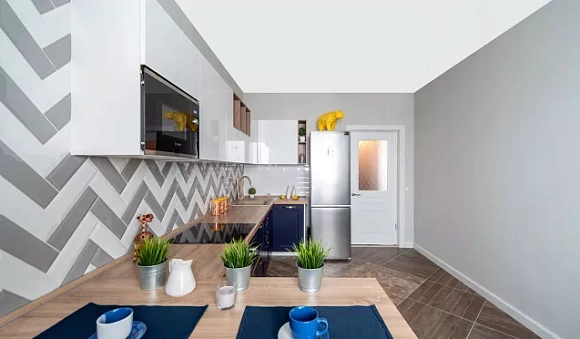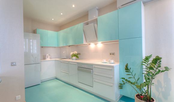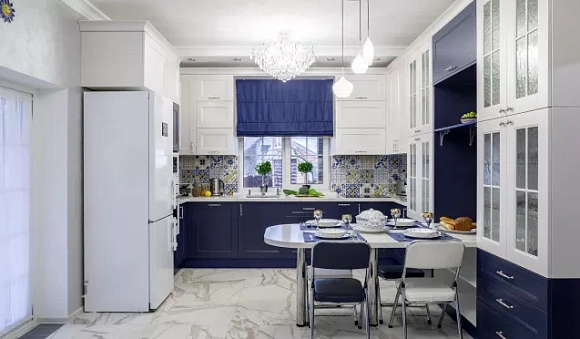 Прекрасным компаньоном синего является белый цвет. Он отлично сочетается с лазурным, ультрамариновым, морским и другими оттенками. Использовать белый можно для отделки верхних модулей, а также стен и потолка.