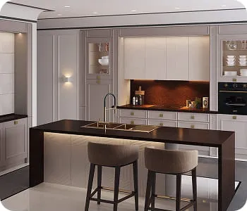 В зависимости от выбранного решения фасады кухонь украшает фрезеровка и лепные элементы, стеклянные витражи, инсталляции из кристаллов Swarovski, красочная фотопечать, покрытие из матовой или ультраглянцевой эмали. Поклонникам индустриальных направлений мы предлагаем оригинальную мебель, поверхности которой стилизованы под мрамор, бетон, кожу.