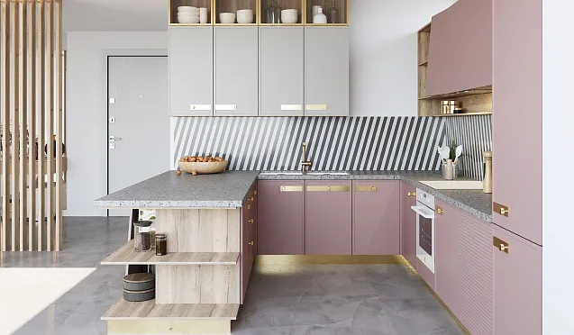 Кухня на заказ с открытыми верхними полками – подходящее решение для небольших помещений. Подобные модели позволяют сохранить воздушность и свет, не перегружают помещение. При этом на полках удобно хранить высокие емкости, стопки тарелок и банки со специями.