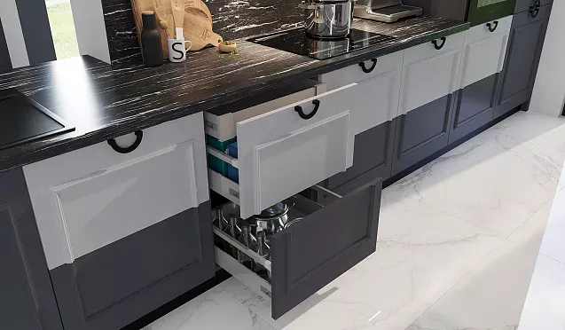 Используя выдвижные системы, вы избавите себя от необходимости покупать лишние контейнеры и лотки для хранения. Все специи, крупы, бутылочки с маслом и, конечно, посуда всегда будут у вас под рукой.