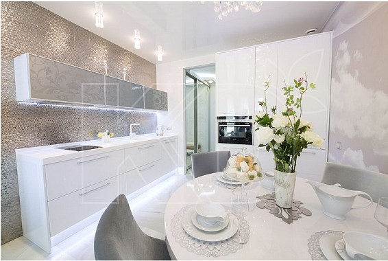 Белая глянцевая кухня в интерьере
