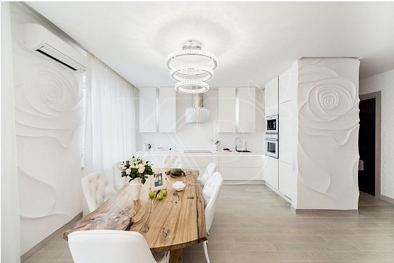 Еще одно достоинство белой мебели – ее универсальность. Этот цвет удачно вписывается как в классические, так и в современные интерьеры, и гармонично сочетается абсолютно с любыми другими оттенками. Выбирая белоснежный глянцевый гарнитур, вы сможете воплотить в жизнь все свои дизайнерские задумки и фантазии: выбрать яркий или приглушенный цвет обоев и напольного покрытия, декорировать фасады золотой патиной, лепниной или инсталляциями из кристаллов Swarovski, украсить интерьер красочным фартуком-скинали с оригинальной фотопечатью.