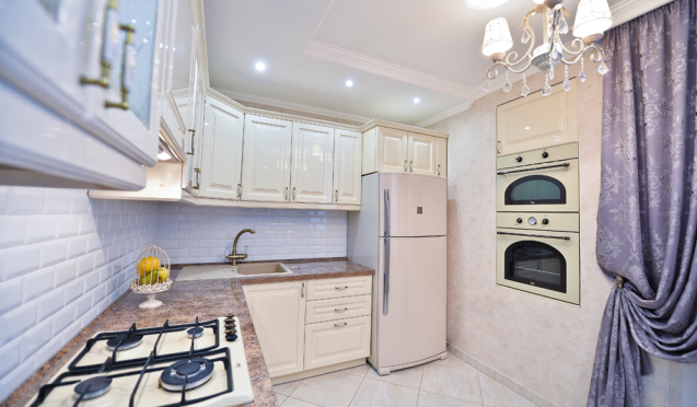 Неоклассические кухни в бежевых тонах выглядят особенно воздушно. С их помощью можно создавать стильные интерьеры, чем охотно пользуются многие дизайнеры. Для кухни в стиле неоклассики характерно использование лаконичного декора в виде вставок из стекла или металла. Также в качестве декоративного оформления применяются точечные светильники и светодиодные ленты. Их устанавливают для подсветки полок и рабочих поверхностей.