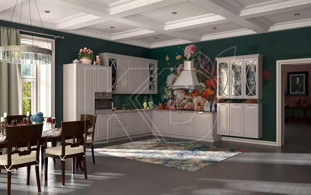 2. Размер. Мебель размещается в больших столовых и поэтому имеет большие размеры. Планировка - П-образная или квадратная, обычно с островом. Кухонные гарнитуры более сложные и часто имеют барную стойку или витражные шкафы. Дешевые модели обычно меньше по размеру и имеют линейную планировку.