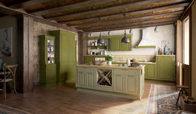 Зеленые кухни. Дизайнеры используют разные оттенки зеленого при создании гарнитуров в деревенском стиле. Версии оливкового и фисташкового цвета будут уместны в пространствах любого типа. А вот изумрудно-зеленые модели лучше интегрировать в комнаты больших размеров.