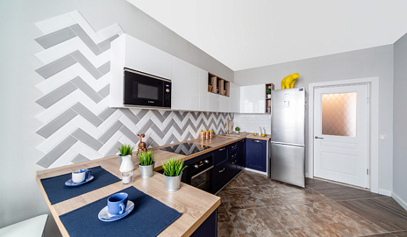 Кухни с барной стойкой. Подобные версии обычно применяются в больших комнатах. При этом стойка может не только стандартной, но и складной, многоуровневой. Ее можно использовать для совместной готовки, в качестве обеденного стола.