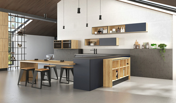 Кухни с островом. Островные модели часто используются в просторных квартирах-студиях. С их помощью можно отделить обеденную зону от гостиной. При этом дополнительный элемент часто используется в качестве рабочей зоны или вместо привычного стола.