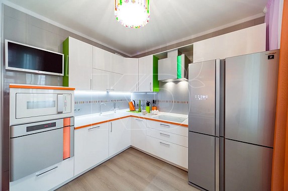 - Великолепная комбинаторность. Часто дизайн кухни в белом цвете настораживает потому, что не хочется в результате получить обезличенное пространство, ассоциирующееся с медицинскими учреждениями. Но для того, чтобы избежать подобного эффекта, достаточно ярких аксессуаров. Или же всегда можно выбрать белый гарнитур, в котором будут объединены несколько оттенков. Подобный подход удобен для тех, кто не хочет тратить лишнее время на уборку. Нижние модули в данном случае делаются более темными, а верхние, контактирующие с грязью меньше, светлыми.