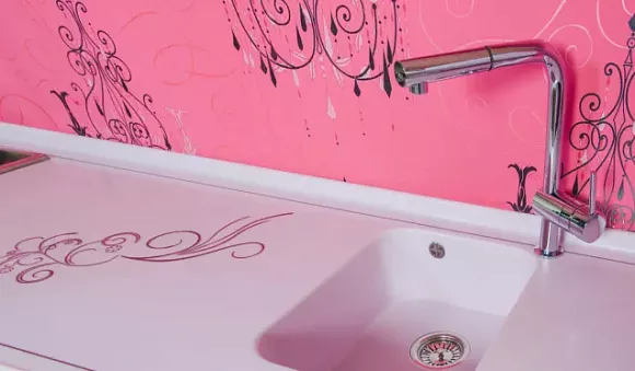 Бюджетный вариант интерьера кухни в фиолетовых тонах предполагает водоэмульсионную краску на стенах. Светлая отделка хорошо сочетается с сиреневым гарнитуром. Маленькие фиолетовые помещения с розовыми, кремовыми или белыми стенами визуально кажутся больше. Рабочую зону можно отделать керамической плиткой со светло-фиолетовыми узорами. На акцентной стене хорошо смотрятся фотообои, на которых изображены цветы, пейзаж или натюрморт.