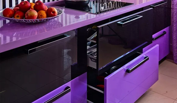 Справка: по мнению психологов, кухни в фиолетовых тонах положительно влияют на качество сна и существенно повышают реальные показатели работоспособности.