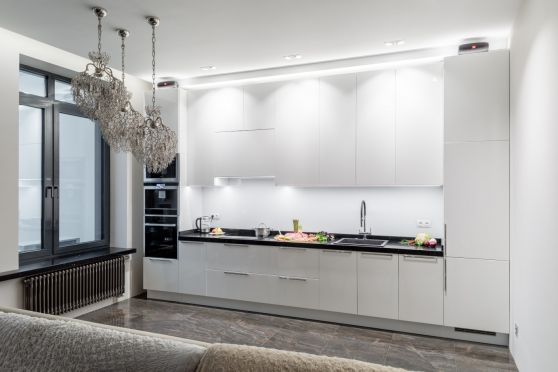 Богатая палитра оттенков. Глянцевые поверхности могут иметь любую расцветку. Помимо классических белых, бежевых и коричневых гарнитуров, производители выпускают версии желтого, красного, фиолетового, серого и зеленого цвета. Кухни на заказ могут сочетать в себе несколько оттенков. Такие комбинированные версии смотрятся весьма необычно и привлекательно.