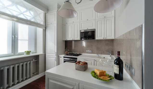 Кухни с островом подходят для просторных квартир-студий. В этом случае две вершины рабочего треугольника размещают в линию, а третью выносят на остров. Обычно выбор техники, которая будет встроена на дополнительную конструкцию, зависит от расположения коммуникаций.