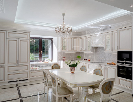 • Классика. Вечно актуальный вариант уместен и в частном доме. Он подойдет кухне с большими окнами и высокими потолками.