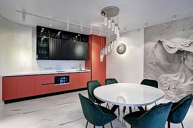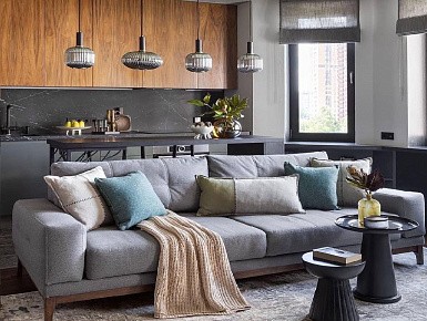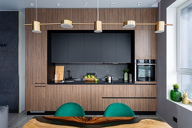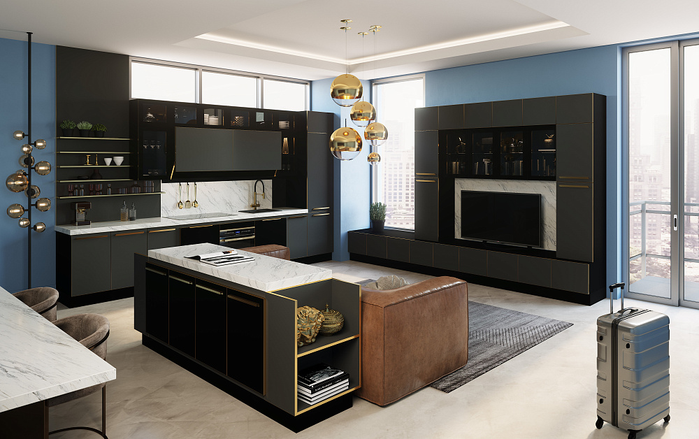 В больших помещениях кухня и гостиная часто оказываются совмещенными. Визуально отделить одну зону от другой можно с помощью островной конструкции, барной стойки или стеллажа. Зонирование с помощью кухни на заказ от производителя технически выполнить гораздо проще. Дело в том, что комплект будет изготовлен с учетом архитектуры пространства.