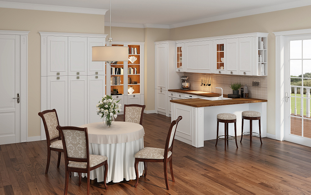 Компания «Кухонный Двор» производит мебель из натуральной древесины и качественного МДФ. Мы готовы разработать для вас проект линейной, островной, П-образной, угловой или параллельной кухни. При этом будут учитываться все особенности помещения – размеры, расположение окна, наличие ниш и выступов. Преимуществами нашей продукции являются следующие показатели: