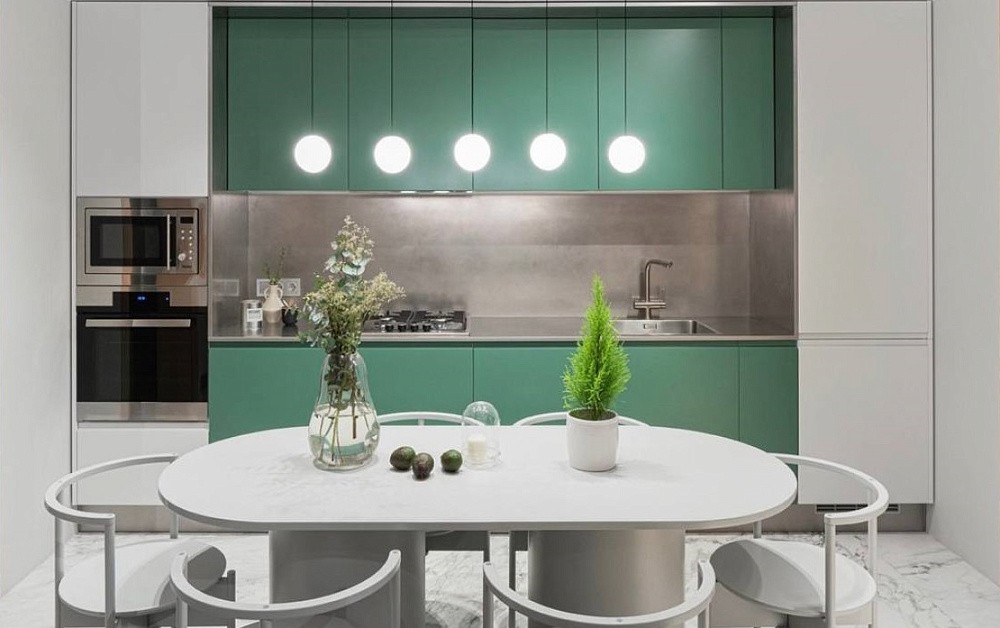 Высокие шкафы-пеналы обычно устанавливают по краям. В них можно спрятать некоторую бытовую технику, а на самые верхние полки убрать предметы, которые используются очень редко.