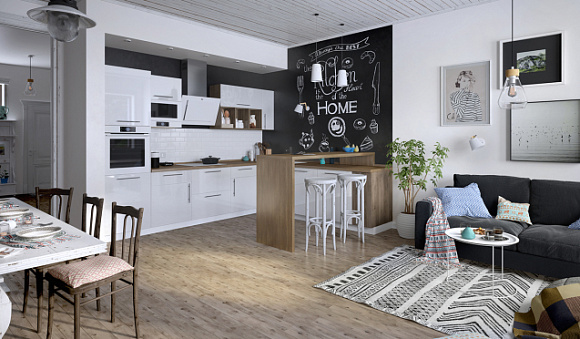 Кухни лофт. Подобные версии подходят для создания непринужденных интерьеров, в которых остаются открытыми системы коммуникации, не декорируется кирпичная кладка или штукатурка. В компактную комнату лучше внедрять комплект лофт с открытыми навесными полками вместо верхнего ряда шкафов. В этом случае сохранится необходимый простор и воздушность.