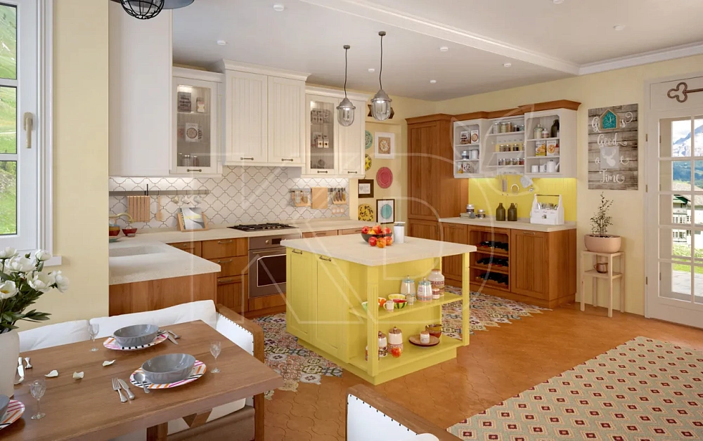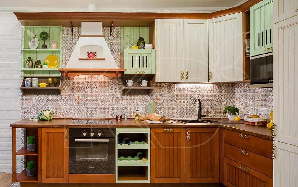 Также дуб применяют для создания комплектов в духе кантри. Природная палитра оттенков передает теплоту сельского стиля, его особое очарование и уют. Фасады таких моделей декорируют решетками и рамками, что создает завершенность и гармоничность дизайна.