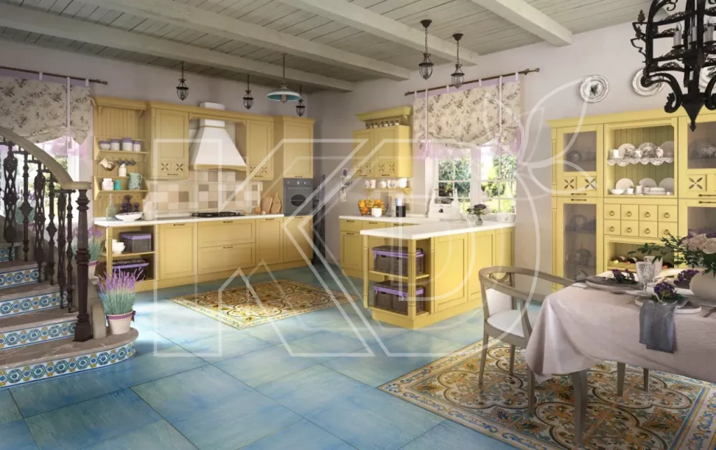 Прованс создает атмосферу спокойствия и тепла. В качестве отделочных материалов в интерьере используется дерево и камень. Для отделки стен применяется декоративная штукатурка и влагоустойчивая краска. Расцветка поверхностей может быть в тон кухонному гарнитуру или светлее. Темные тона использовать нежелательно, чтобы не нарушить концепцию стиля.