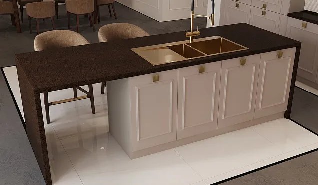 Кварцевая столешница выделяется такими достоинствами: