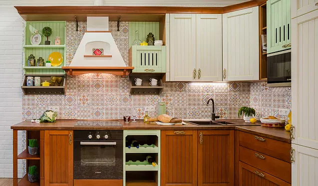 Затем необходимо продумать отделку кухонного фартука. Поверхность является самой нагруженной и поддается регулярному воздействию влаги, жира и высоких температур.