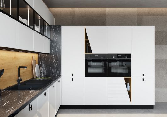Наиболее оптимальным вариантом для загородных домов и просторных квартир являются П-образные кухни. Такая модель займет место сразу возле трех стен. Данные гарнитуры имеют несколько рабочих поверхностей, большое количество выдвижных ящиков, полок и секций.