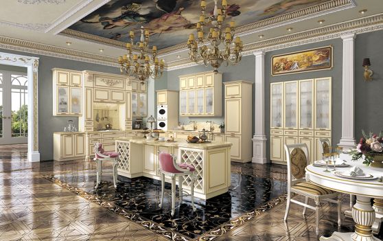 Кухонная мебель в стиле барокко смотрится изысканно и аристократично. Большое количество завитушек, лепнины и другого затейливого декора предпочитают истинные любители роскоши и изящества. Подобные модели выполняют в разном цвете, поэтому подходящий вариант можно подобрать для любого помещения.