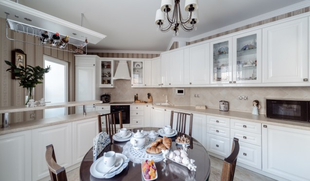 Такие кухни не теряют свою актуальность долгие годы, ведь стиль отличается роскошью, изыском и сбалансированностью всех деталей. Цветовая основа состоит из светлых нежных оттенков, также в качестве дополнения часто используется золотистый цвет (именно он придает определенную роскошь предметам). Обеденный стол выполняется из массива дерева и является центром композиции: вокруг него строится всё кухонное пространство. Кухни классика до сих пор становятся частым выбором потребителя.