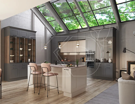 В каталоге бренда «Кухонный Двор» представлены похожие кухни в ванильной гамме. Например, модель «Стоун Грэйс». Она сочетает в себе элементы различных стилей. Фасады с классической фрезеровкой и карнизами здесь соседствуют с минималистичной фурнитурой и прозрачными витражами. В интерьере кухни пастельные оттенки сочетаются с глубокими.