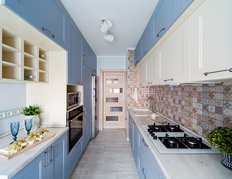Продвинутый вариант линейной конфигурации – параллельная. Здесь модули кухни располагаются по обеим сторонам от центра комнаты. Такой вариант хорошо подходит для длинных, но узких помещений – они сразу кажутся более просторными. Правда, в этом случае советуем выбирать для фасадов нежные, пастельные оттенки.