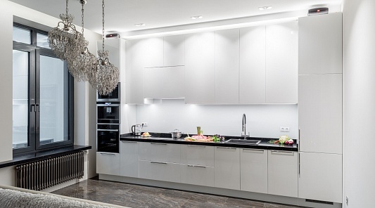 • Визуально уравновесить узкое и длинное помещение помогут шкафы-колонны. Одновременно они позволят разместить большее количество необходимой утвари на маленькой прямой кухне. Также колонны можно использовать для монтажа встроенной бытовой техники. Это выглядит стильно.