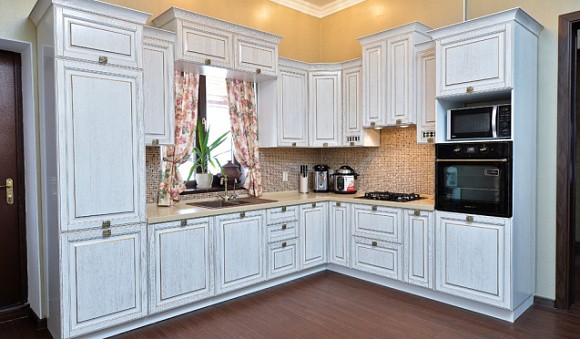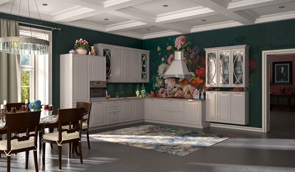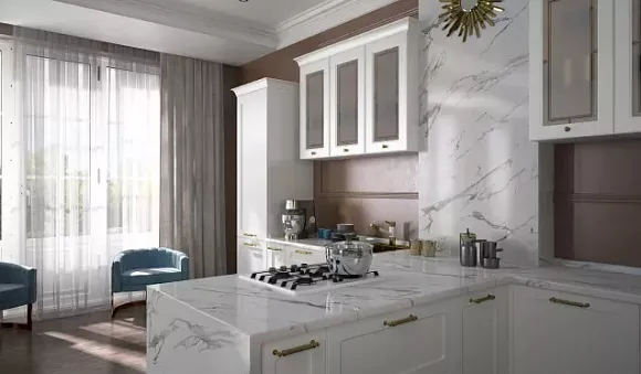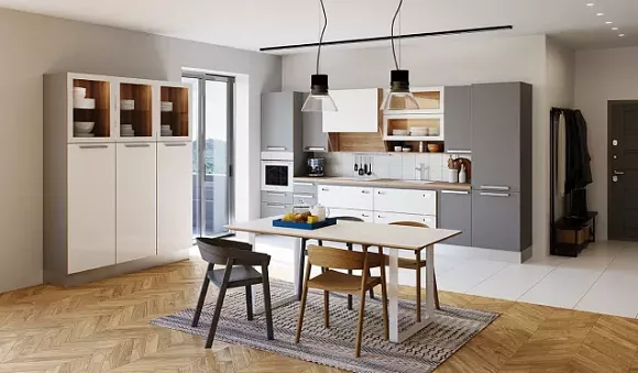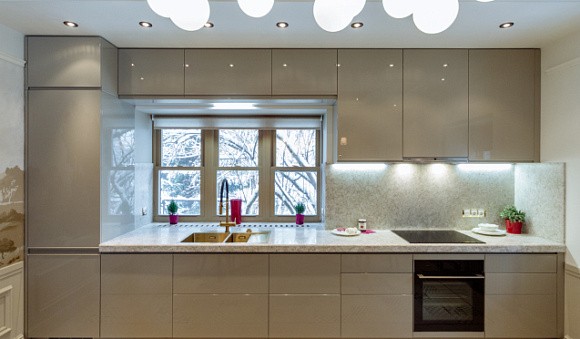 Приветствуется оформление пола, столешницы и фартука в разбеленных серых цветах. Атмосферу праздника помогут создать серебристые детали. К светло-серым фасадам прекрасно подойдет мрамор или камень, белая дубовая столешница, серебряная и золотая фурнитура.
