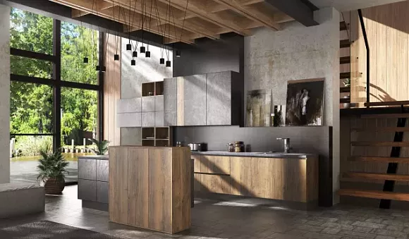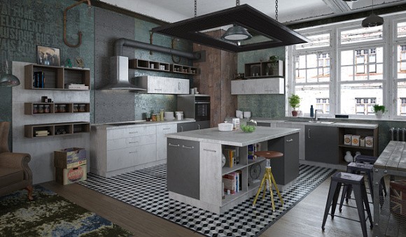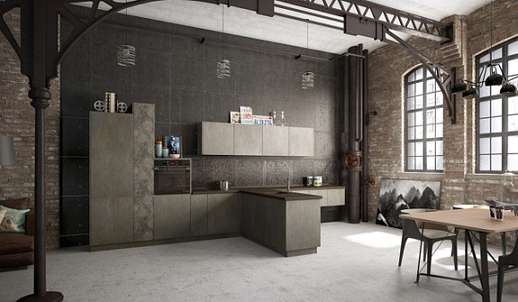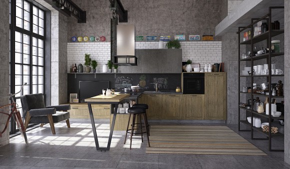 На серой кухне, выполненной в лофте, хорошо смотрятся бетонные или кирпичные стены. Маленькое помещение желательно оборудовать светлым гарнитуром. Для разбавления нижних темных фасадов используйте нейтральный белый верх.