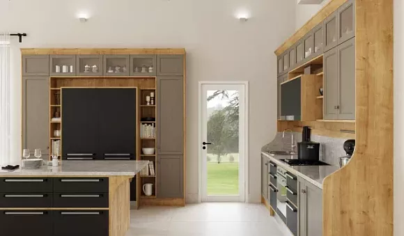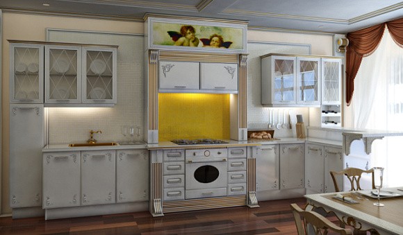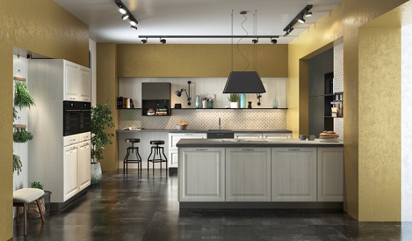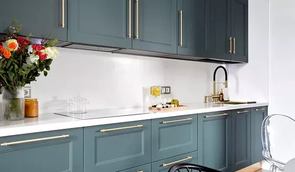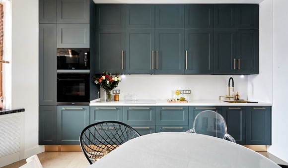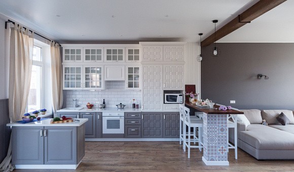 Неоклассические кухни в серых тонах предполагают разбавление серебристым, графитовым и серо-голубым оттенками. Строгий интерьер можно дополнить классическими золотыми ручками, которые сделают его элегантным и утонченным.