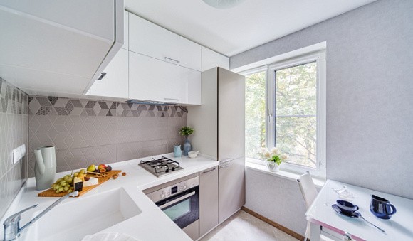 Американский стиль предполагает наличие светло-серых фасадов. Он подходит для крошечных кухонь.