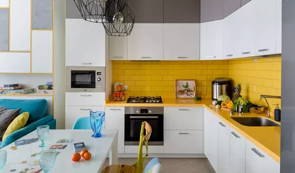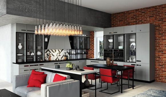 Сочетание серого цвета и насыщенных акцентов выглядит особенно стильно. Текстиль, фартук или глянцевые фасады выглядят еще привлекательнее с красными вкраплениями. Сочные розовые акценты помогут создать гламурный интерьер серой кухни, а неброские бледно-розовые тона используют для формирования умиротворенной атмосферы. Серая кухня с лиловыми нотками выглядит женственно и романтично, а с фиолетовыми – респектабельно. Плохо освещенную серую кухню необходимо оформлять в солнечной гамме. Массивная люстра, имеющая тканевый абажур, или желтые фасады прекрасно сочетаются с серыми стенами.