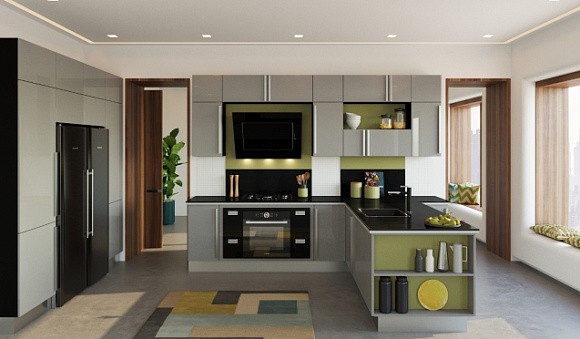 Глянцевая кухня в серых тонах выглядит оригинально и зрительно увеличивает помещение. Просторную кухню можно оформить в графитовых и цветах. Она будет прекрасно сочетаться с серебристыми светильниками, ручками, смесителями и нержавеющими мойками или различными баночками и посудой, у которой есть хромированные крышки.