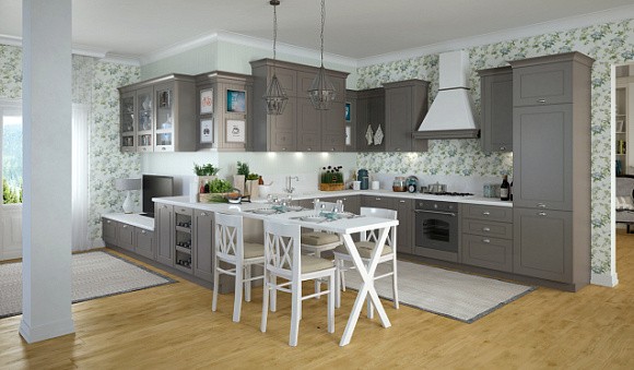Кухни в серых цветах в стиле кантри очень уютные. Для них подходит пастельная палитра. Такое помещение желательно оборудовать светло-серым гарнитуром, а для разбавления использовать бежевый и белый цвета.