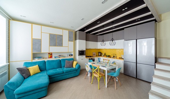 Двухцветное оформление используют для разграничения кухонного пространства, если к нему присоединена гостиная. Зонирование выполняют с помощью острова, барной стойки или других модульных конструкций.