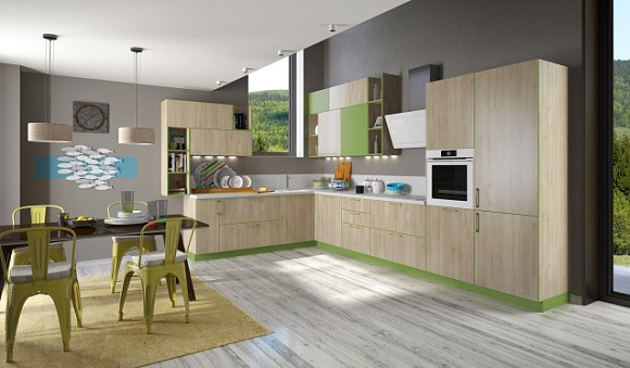 Зеленые кухни. Установка ниши или перегородки с полками решат проблему обустройства пространства навсегда. Это оптимальный вариант, который позволяет максимально задействовать все предметы мебели. Кроме того, перегородка и ниша могут быть выполнены в стиле глухих конструкций.