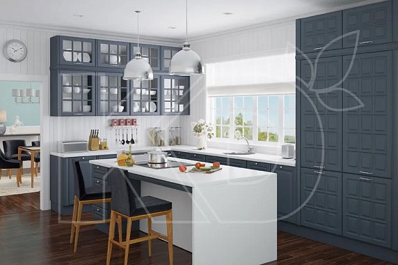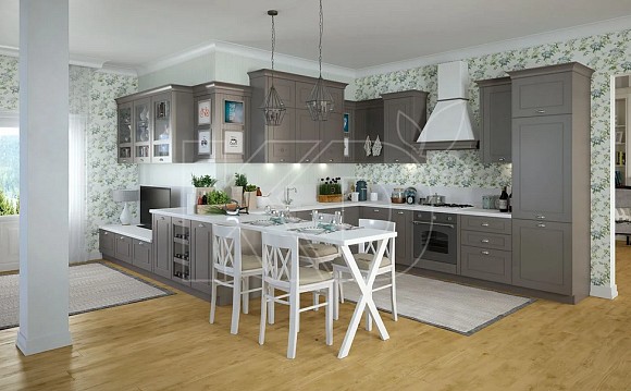 Цветовая палитра, в которой оформляется мебель, отличается богатым выбором оттенков. Кухонный гарнитур может быть светло-оливкового, песочного, голубого, светло-серого, молочно-белого и бежевого цвета с кварцевой, ониксовой, мраморной, искусственной гранитной или деревянной столешницей.