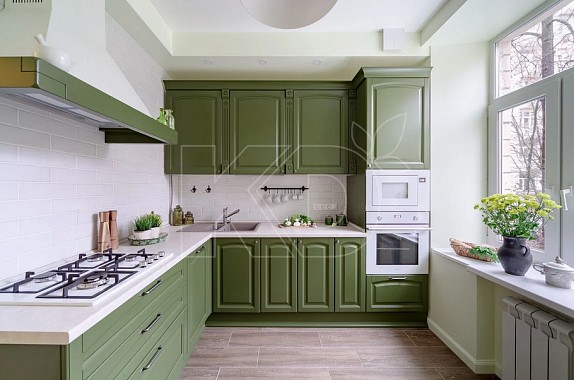 Одним из наиболее удачных вариантов считается угловая кухня в зеленом цвете – она помогает рационально использовать пространство и сделать процесс кулинарного творчества максимально удобным.
