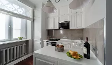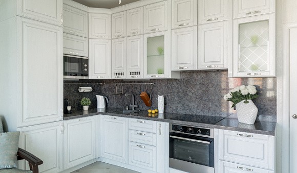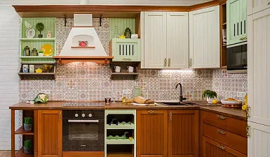 Более авангардные решения, в которых на фасадах мебельного гарнитура применяются вставки из натурального дерева или белые блоки – смотрятся более свежо в любой обстановке вне зависимости от степени освещенности. Они понравятся почитателям стилей прованс, эклектика и модерн.
