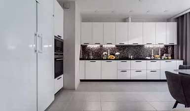 Самыми эффектными кухнями на 2023 год считаются модели с контрастным сочетанием блоков, выполненные из экологичных материалов в комплектации фасадов из МДФ и экомембраны со стилизацией под светлое и темное дерево.
