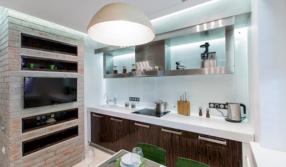 Для интеграции в просторное помещение с хорошим дневным освещением можно выбрать вариант с темными фасадами. Подобные гарнитуры часто выполняют в стилях лофт и хай-тек. С их помощью можно визуально уменьшить высоту потолка или сузить стены.